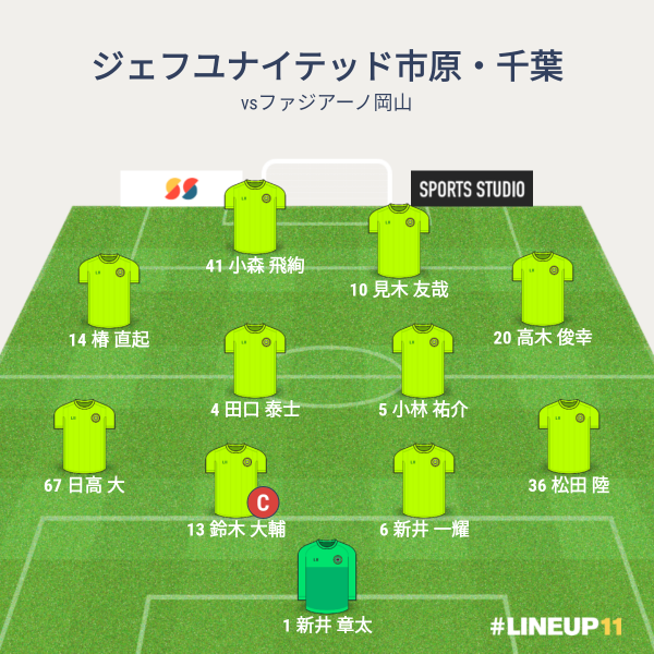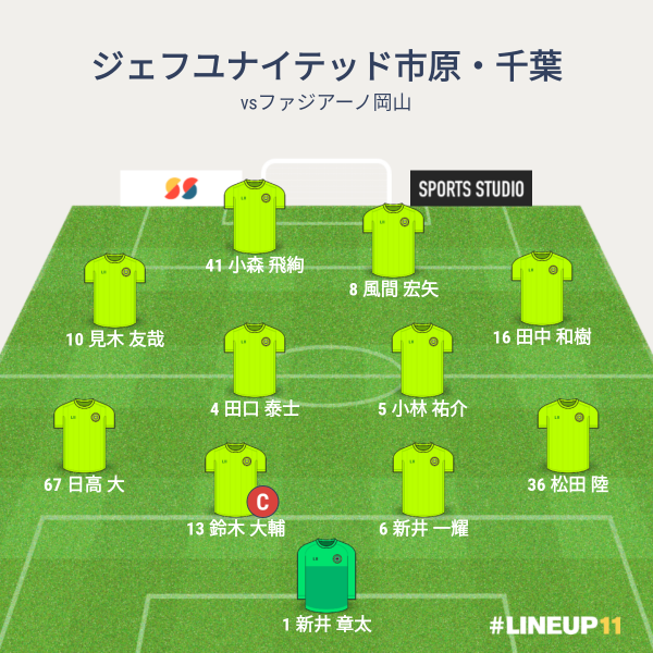 ジェフの先発メンバーは、GKに新井、CBに新井一輝、鈴木、右SBに松田、左SBに日高、ボランチに田口と小林、右MFに田中、左MFに見木、2トップに風間と小森という布陣でした。