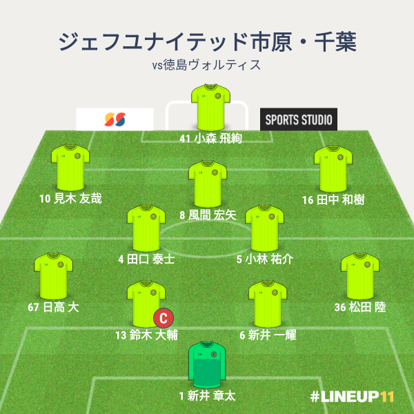 ジェフの先発メンバーは、GKに新井、CBに新井一輝、鈴木、右SBに松田、左SBに日高、ボランチに田口と小林、右MFに田中、左MFに見木、トップ下に風間、1トップに小森という布陣でした。