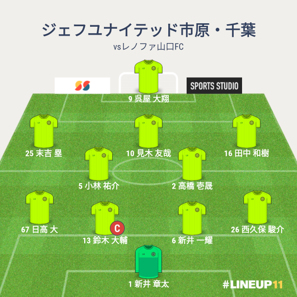 ジェフの先発メンバーは、GKに新井、CBに新井一輝、鈴木、右SBに西久保、左SBに日高、ボランチに小林と壱晟、右MFに田中、左MFに末吉、トップ下に見木、1トップに呉屋という布陣でした。前節から、何人かメンバーを変更してきました。