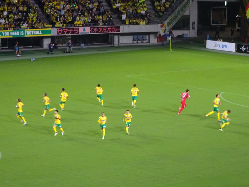 前半24分、ジェフはカウンターから見木、ドゥドゥと繋がって、抜け出した呉屋が倒されてFKとなる。このFKを田口が狙うが上に外れる。