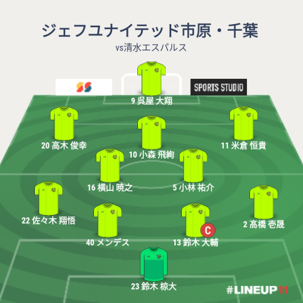ジェフの先発メンバーは、GKに鈴木椋大、CBに鈴木とメンデス、右SBに壱晟、左SBに日高、ボランチに小林と横山、右MFに田中、左MFにドゥドゥ、トップ下に風間、トップに小森という布陣でした。