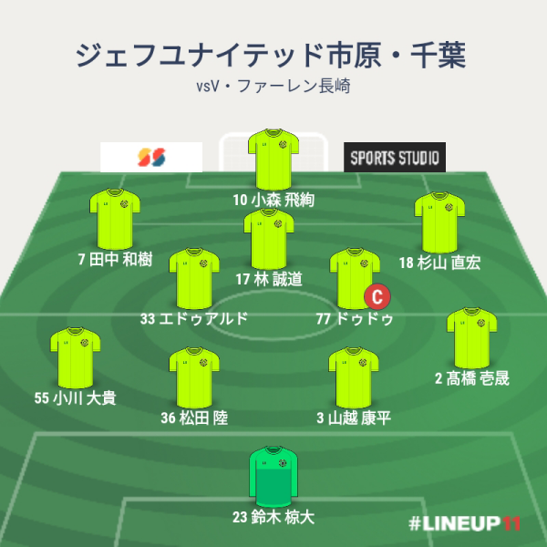 ジェフの先発メンバーは、GKに鈴木、CBに山越と松田、右SBに壱晟、左SBに佐々木、ボランチに小林とエドゥアルド、右MFに田中、左MFに椿、トップ下に横山、トップに小森という布陣でした。