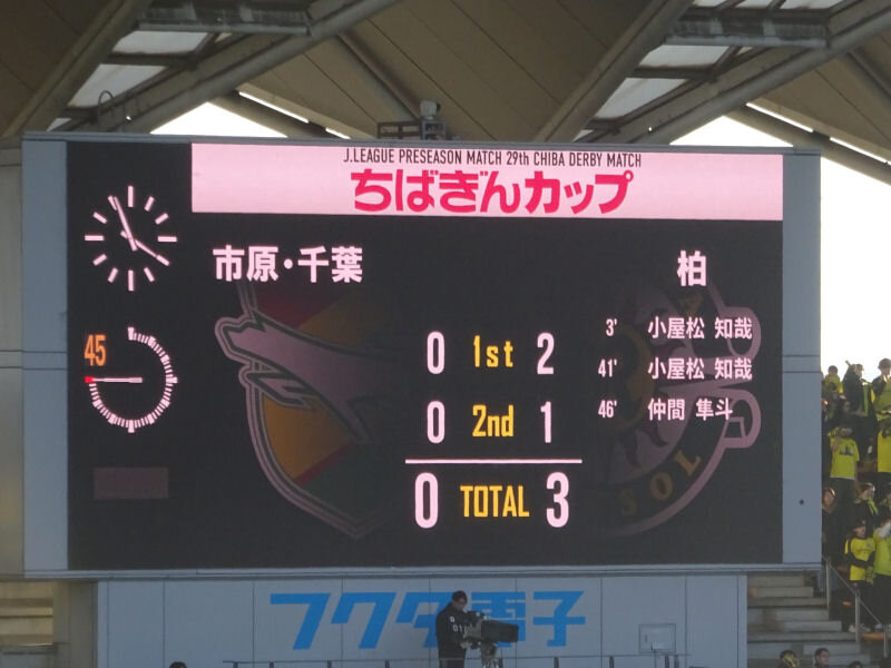 ちばぎんカップ2020 ジェフユナイテッド市原・千葉vs柏レイソルの試合を観戦しにフクダ電子アリーナまで行ってきました。試合は、柏が序盤の2得点で0-2と勝利しました。 -