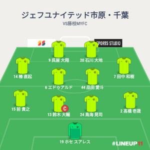 ジェフの先発は、GKにホセ スアレス、CBに鈴木大輔と鳥海、右SBに壱晟、左SBに日高、ボランチに田口と横山、右MFに田中、左MFに椿、2トップにカルリーニョスと石川という布陣でした。前節と先発、サブともに同じメンバーでした。