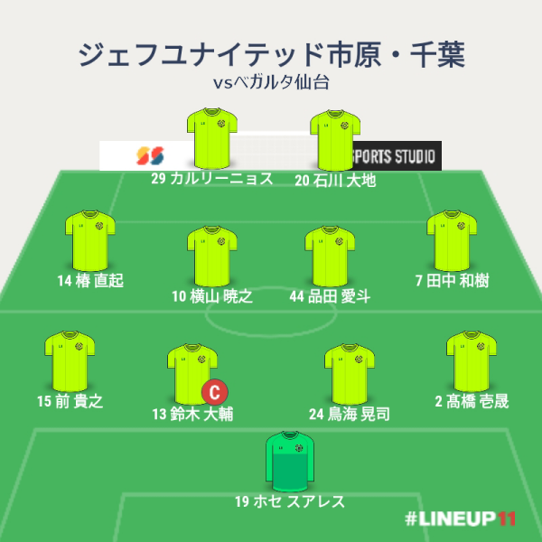 ジェフの先発メンバーは、GKにスアレス、CBに鈴木大輔と鳥海、右SBに壱晟、左SBに前、ボランチに品田と横山、右MFに田中、左MFに椿、2トップに石川とカルリーニョスという布陣でした。