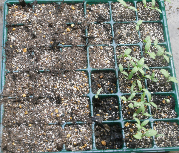 ナスは、大きいものは、ようやく本葉が出てきましたが、定植まではしばらくかかりそうです。 プレーとの空いているところに、コキアとマリーゴールドの種を蒔きました。